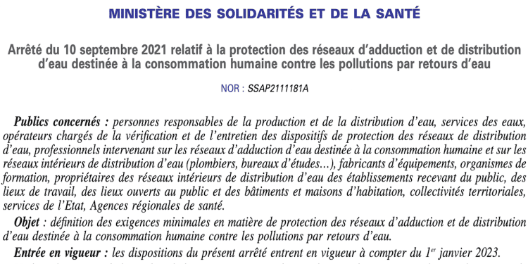 L’arrêté du 10 septembre 2021, publié au Journal Officiel le 18, définit les exigences minimales pour éviter les pollutions par retours d’eau dans les réseaux d’adduction et de distribution d’eau potable. Il est applicable dès le 1er janvier 2023.