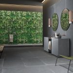 Inspirés de la luxuriance de forêts plus tropicales que domaniales (et donc très à propos dans cette pièce humide), ces « phyto-carreaux » rappellent les ornements en vogue dans le papier peint des années 1960. Fond et feuillages se confondaient alors pour former une trame répétitive particulièrement chargée. La « Ceramic Wallper » Wide&Style proposée par ABK va dans ce sens avec le foisonnant décor Secret Garden (photo d’ouverture) de la collection capsule Dark Edition présentée en avant-première sur le Cersaie 2018. La végétation y forme un épais rideau de frondaisons dont le feuillage, semblant en suspension, confère une étonnante légèreté à cette infranchissable charmille.