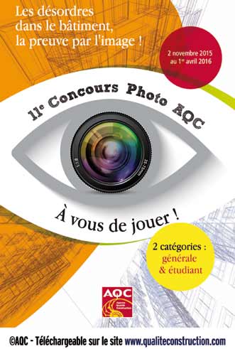 Ouvert jusqu’au 1er avril 2016, le concours « Pathologies du Bâtiment » de l’AQC a pour vocation de sensibiliser par l’image sur des problèmes qui toujours ont pour origine des malfaçons. Photographes amateurs et professionnels du bâtiment (ou pas) sont invités à observer, photographier, qualifier et partager les désordres qu’ils rencontrent, qu’ils soient liés à la dommage-ouvrages, courants ou exceptionnels, situés dans la maison individuelle ou l’habitat collectif, dans des bâtiments industriels ou tertiaire. Une manière comme une autre de faire des focus sur les bonnes pratiques, à découvrir, en même temps que le règlement de ce concours, sur le site Qualiteconstruction.com, rubrique Outils pédagogiques.