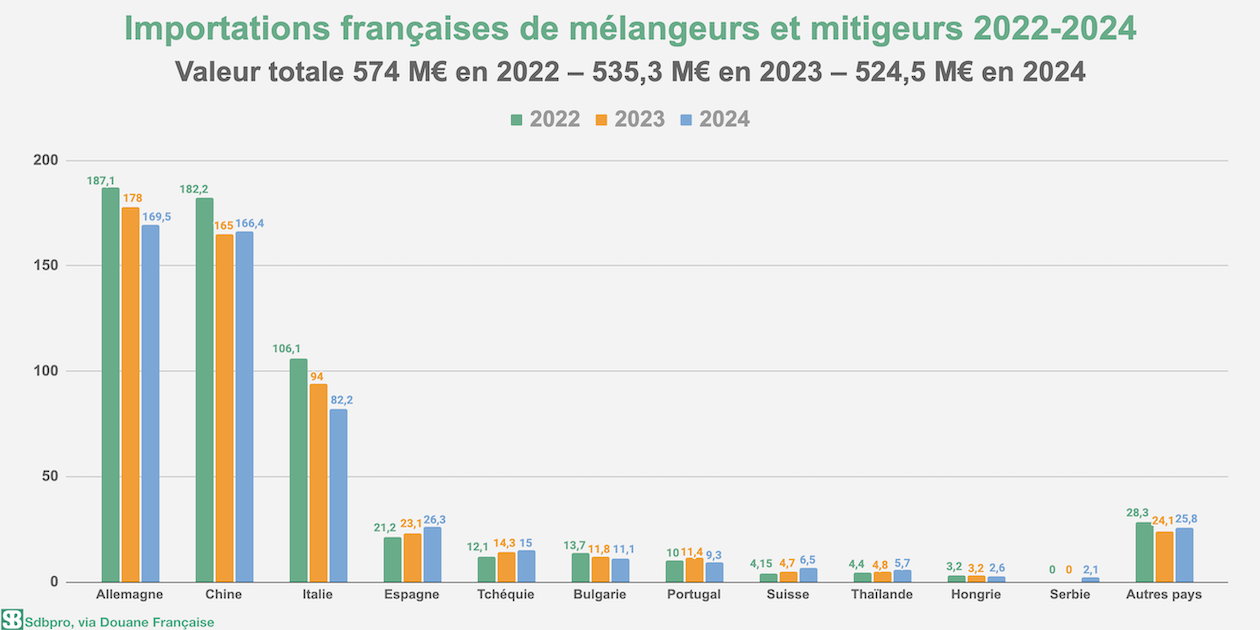 En 2024, les importations de mélangeurs et mitigeurs, qui ont atteint, selon Douane Française, 524,5 millions d’euros, régressent légèrement, de -2 % par rapport à 2023, après un recul de -6,7 % en 2023 par rapport à 2022. Mais, si l’on considère 2025 – août 2024 à juillet 2025 –, elles sont reparties à la hausse, de +3,6 %.