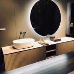 Meuble de salle de bains surmonté d'un gros miroir rond.
