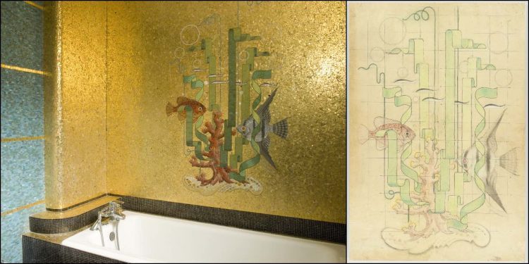 Pour la salle de bains de sa propre maison (rue Joseph-Sauveur à Rennes, construction de l’architecte Yves Lemoine dans les années 1940), Isidore Odorico imagine un décor aquatique, mêlant smaltes bleus, verts et or. Un couple de poissons dont les silhouettes de profil s’affrontent évolue parmi les algues-rubans qui dansent au-dessus d’un bouquet de corail dans une scène d’une élégance rare… (photo et croquis d’ouverture). Ailleurs, ce sont des méduses qui s’invitent sur des murs, leur ombrelle affleurant à la surface d’un océan de tesselles bleutées dans lequel tentacules et filaments ondoient, dans une recherche aboutie de mouvement.