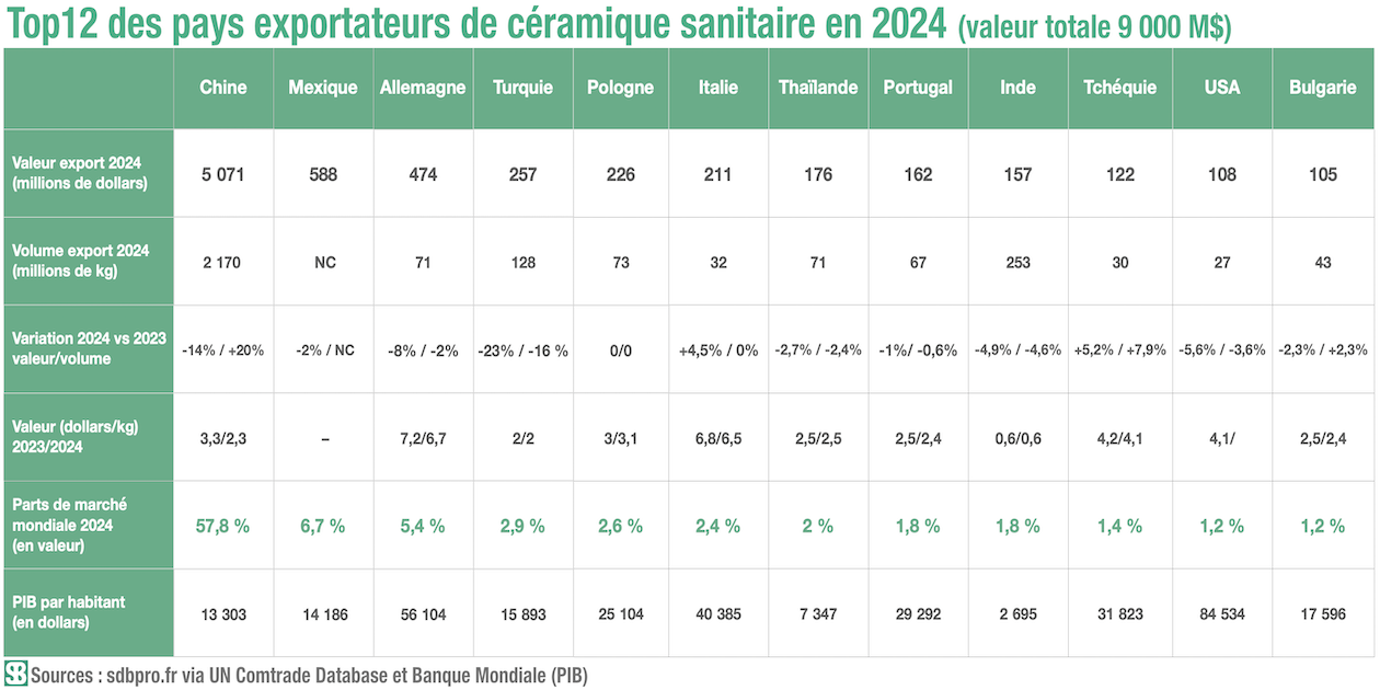 La valeur globale des exportations mondiales de céramique sanitaire a reculé en 2024 par rapport à 2023, de 9 891 à 9 000 millions de dollars, soit une contraction de -9 %. Et, si l’on en croit cette base de données, même la Chine l’a subie, dont les exportations ont reculé de -14 % en valeur tout en augmentant de 20 % en volume.