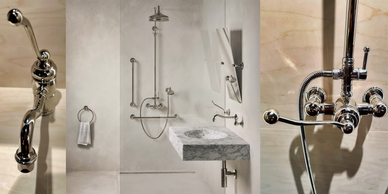 A contrario des propositions souvent standardisées, les produits PMR de cette extension de gamme ne sont pas seulement fonctionnels, ils revisitent le passé pour améliorer le confort d’utilisation. Au point d’eau comme dans la douche, un levier allongé remplace les manettes et cabochons en porcelaine de Limoges, facilitant l’ouverture et la fermeture de la robinetterie sans trahir les lignes rétro. Actionnable d’un simple mouvement (de coude, par exemple, depuis un fauteuil roulant), cette poignée ergonomique affiche des formes arrondies, délicatement ouvragées. Le design étant fidèle à celui de l’ensemble de la collection (jusqu’aux rosaces de la barre d’appui coordonnée), l’harmonie est assurée entre toutes les pièces d’eau, y compris PMR, que le style rétro contribue à universaliser, notamment dans les projets d’hôtellerie haut de gamme.