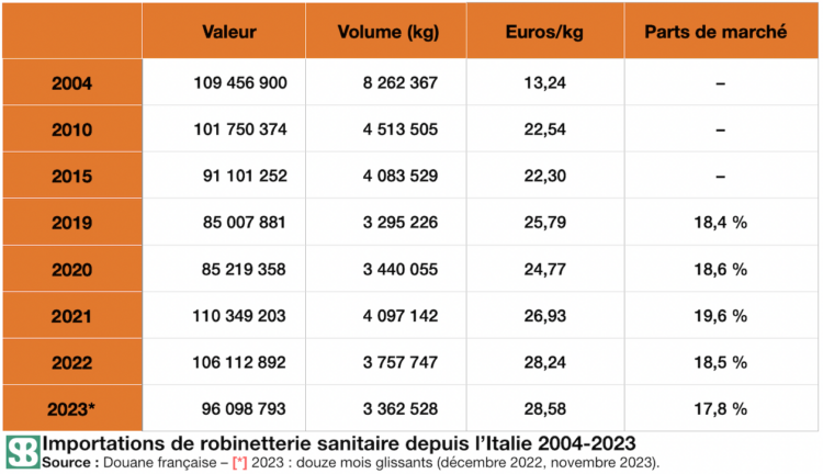 Mais il est intéressant de noter que, au fil des années, ce que les robinetiers italiens ont perdu en volume, ils l’ont récupéré en valeur. En sortant de la GSB, en se désengageant des MDD, en mettant en avant leurs marques…, progressivement, ils sont montés en gamme, dépassant même l’Allemagne du point de vue du mix-produits. Ainsi, la valeur des robinetteries italiennes est passée de 13 à 29 euros/kg en 2023, à comparer aux 17 et 22 euros/kg de l’Allemagne et aux 5 et 12 euros/kg de la Chine. Ce qui montre, si besoin était, l’agilité de ces industriels…