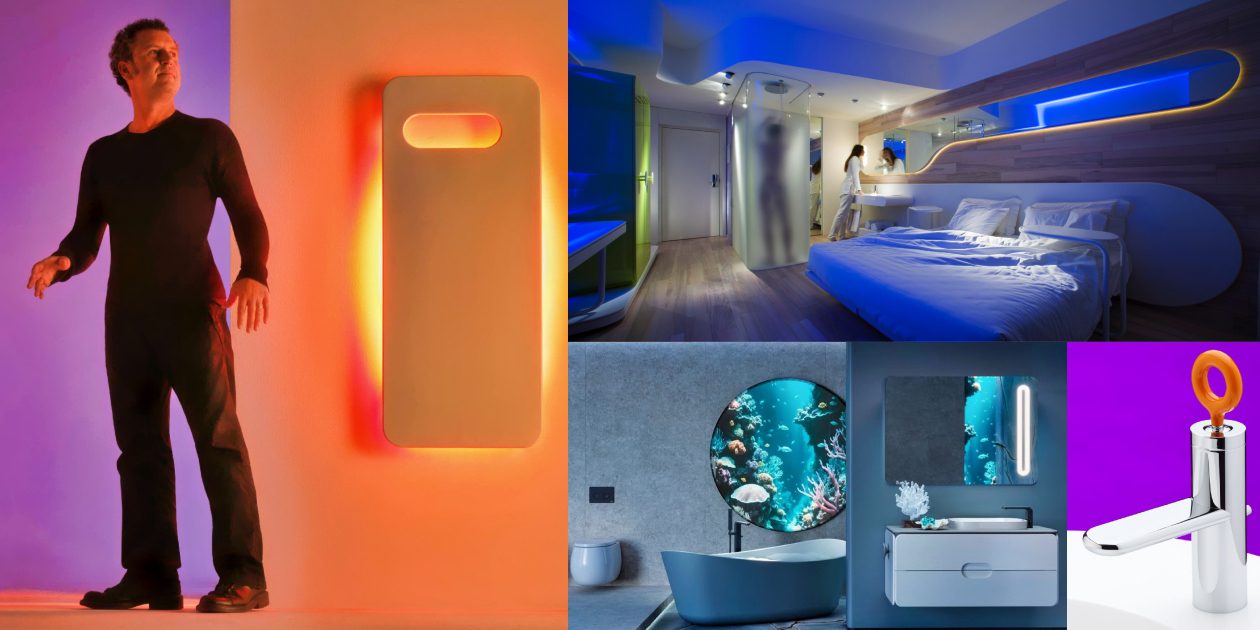 Photos d’illustration : Simone Micheli aux côtés du radiateur sèche-serviettes Badge de Cordivari (2007) – Hôtel Barcelo (Milan, 2012) (Simone Micheli Architectural Hero/photo Maurizio Marcato) – Collection New Lounge Fluid de Porcelanosa (Noken, 2024) – Ring (St Rubinetterie, 2011/photo Jürgen Eheim).