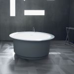 Le sens de la pose peut même souligner les volumes de la pièce (Revigres, collection Cromatica, décors chevron et cube) en usant de carreaux unis, tandis qu’une géométrie complexe se développe au sol, sur de plus grands formats (Ceramica Bardelli, collection Palladian, design Studiopepe). Dans le registre des panneaux XXL, Casal Grande Padana, spécialiste du 120 x 140 cm avec la collection Pietre di Paragone issue de la nouvelle génération de dalle en grès Kontinua (ép. 6,5 mm), dévoilait également à Bologne le décor Round Square. Dans un élan proche de l’Op Art, il associe le cercle au carré par transparence et superpositions, et offre une solution très impactante visuellement pour « tapisser » l’espace.