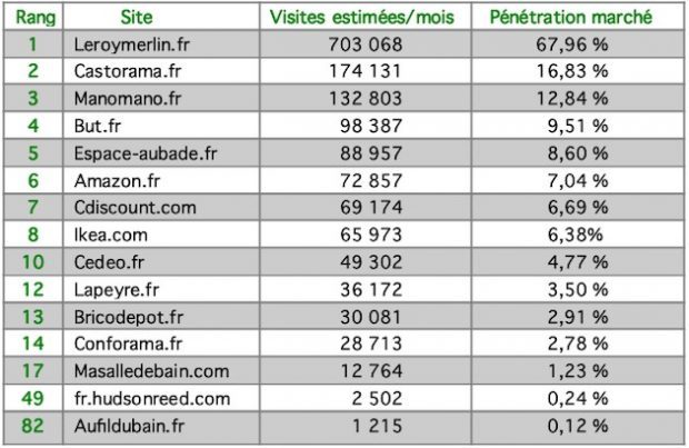Les sites sont classés en fonction de la position moyenne qu’ils occupent réellement : Leroymerlin.fr est bien le premier à émerger sur la majorité des mots-clés, Castorama.fr le deuxième…, Ikea.com le huitième et Cedeo.fr le dixième. Entre ces deux derniers sort un site qui, tel Wikipedia.org, n’appartient pas à l’univers de la salle de bains. Il n’est donc pas cité. C’est pourquoi tous les rangs ne se suivent pas dans ce tableau.