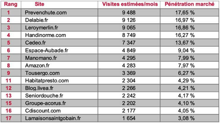Ce baromètre dédié à l’accessibilité dans la salle de bains, réalisé le 2 décembre 2021, s’appuie sur 260 mots clés. Il est à l’image de ce marché de l’accessibilité, à la fois diffus et coupé en deux, avec d’une part les revendeurs de produits destinés au quatrième âge, d’autre part les distributeurs et installateurs de salles de bains.