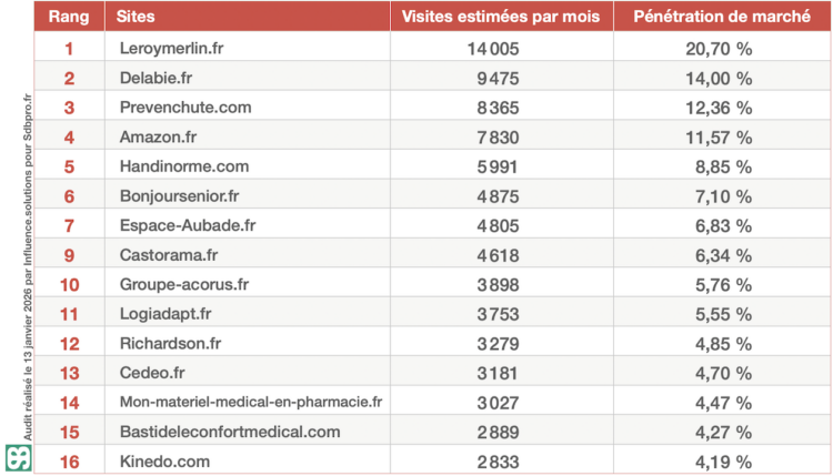 Ce Top 15 est une photographie, réalisée le 13 janvier 2026, des sites d’e-commerce ou de marques émergeant sur les premières pages de Google lorsqu’un internaute tape l’un des 229 mots clés dédiés à l’accessibilité dans la salle de bains que nous avons sélectionnés. Il est réalisé par Influence, agence de référencement naturel avec paiement aux résultats en première page de Google. En aucun cas, il n’est représentatif du trafic global des sites mentionnés, dont les visiteurs sont susceptibles d’arriver en direct, via d’autres sites, des mots clés supplémentaires, une newsletter… Il montre leurs performances en matière de référencement naturel ou SEO sur la famille de produits indiquée.