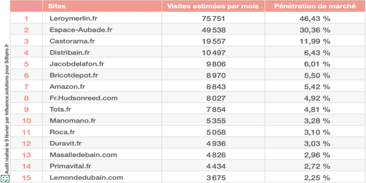 Ce Top 15 est une photographie, réalisée le 9 février 2026, des sites d’e-commerce ou de marques émergeant sur les premières pages de Google lorsqu’un internaute tape l’un des 305 mots clés dédiés à la baignoire que nous avons sélectionnés. Il est réalisé par Influence, agence de référencement naturel avec paiement aux résultats en première page de Google. En aucun cas, il n’est représentatif du trafic global des sites mentionnés, dont les visiteurs sont susceptibles d’arriver en direct, via d’autres sites, des mots clés supplémentaires, une newsletter… Il montre leurs performances en matière de référencement naturel ou SEO sur la famille de produits indiquée. Les sites sont classés en fonction de la position moyenne qu’ils occupent réellement.