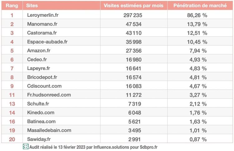 Les sites sont classés en fonction de la position moyenne qu’ils occupent réellement : Leroymerlin.fr.com est bien le premier à émerger sur la majorité des mots clés, Manomano.fr le deuxième…, Cdiscount.com le neuvième et Fr.Hudsonreed.com.com le onzième. Entre ces deux derniers sort un site qui, tel Wikipedia.org, n’appartient pas à l’univers de la salle de bains. Il n’est donc pas cité. C’est pourquoi tous les rangs ne se suivent pas dans notre tableau.