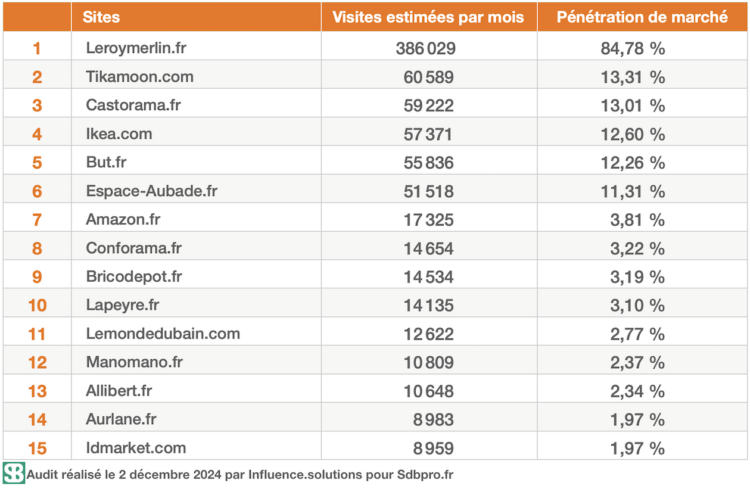 Au quatrième rang s’est installé Ikea.com. Par rapport au précédent audit (juin 2024), il recule d’un rang, mais augmente néanmoins son taux de pénétration, à 13,31 % au lieu de 11,29 %. Un acteur à surveiller, particulièrement sur cette famille de produits.