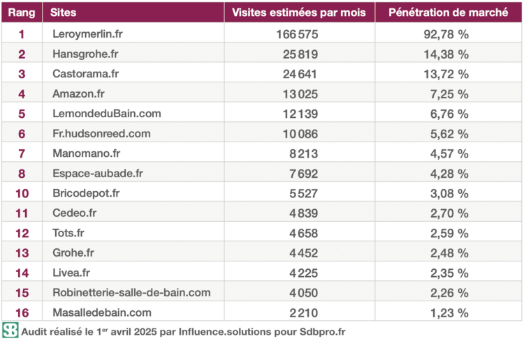 Derrière Leroymerlin.fr, qui lâche un peu de lest par rapport au précédent Top15 (octobre 2024), apparaît Hansgrohe.fr, en deuxième place, tandis que Grohe.fr maintient son treizième rang. Les deux leaders du marché français de la robinetterie résistent !