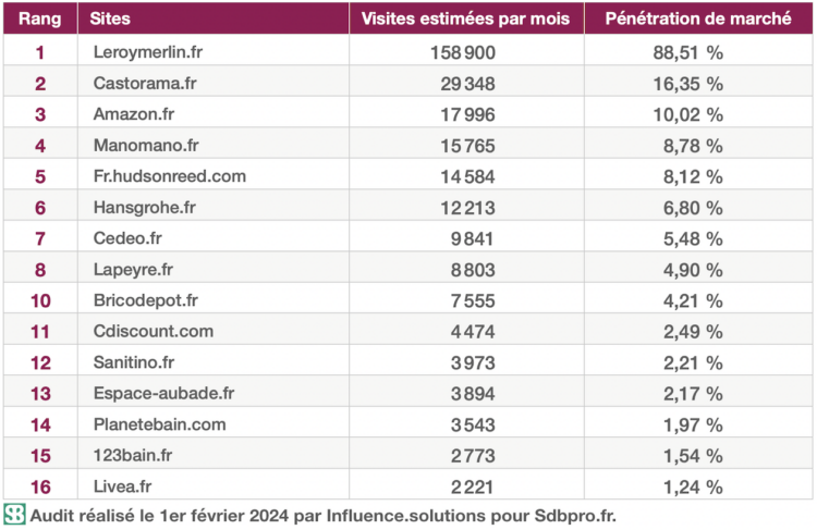 Face à une telle puissance, la partie est donc plus que difficile pour tous les autres sites Internet, qu’ils soient marchands ou pas. Néanmoins, certains progressent : citons Fr.hudsonreed.com, passé du onzième rang en juillet 2023 au cinquième en ce début d’année ; Hansgrohe.fr, du treizième au sixième, et Sanitino.fr, qui fait son apparition dans cette famille de produits également.