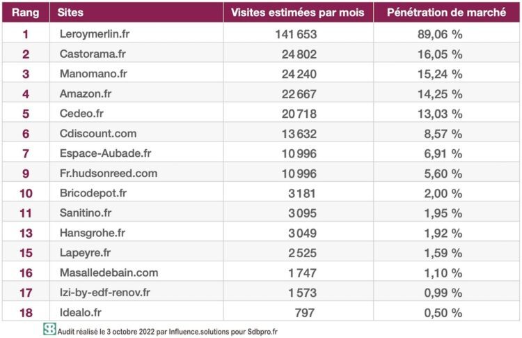 Les sites sont classés en fonction de la position moyenne qu’ils occupent réellement : Leroymerlin.fr est bien le premier à émerger sur la majorité des mots-clés, Castorama.fr le deuxième…, Espace-Aubade.fr le septième et Fr.hudsonreed.com le neuvième. Entre ces deux derniers sort un site qui, tel Wikipedia.org, n’appartient pas à l’univers de la salle de bains. Il n’est donc pas cité. C’est pourquoi tous les rangs ne se suivent pas dans ce tableau.