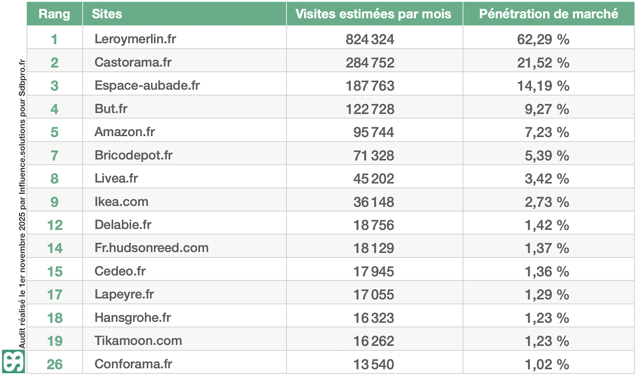 Dans ce nouveau Top15 dédié à la salle de bains, Leroymerlin.fr décroche et tous ses suiveurs en profitent… En ce premier jour du mois de novembre 2025, l’enseigne a en effet perdu quelques premières places de choix, sur des expressions qui, telles toilette, baignoire, paroi de douche, wc suspendu, sèche-serviette, meuble de salle de bain…, font l’objet du plus grand nombre de requêtes et comptent donc plus que les autres. Des places évidemment récupérées, notamment par Castorama.fr et Espace-aubade.fr, lequel a gagné deux rangs par rapport au précédent audit du mois de mai 2025. Mais – ne rêvons pas – tout cela devrait rentrer dans l’ordre, si ce n’est déjà fait, et Leroymerlin.fr retrouver ses positions au sommet…