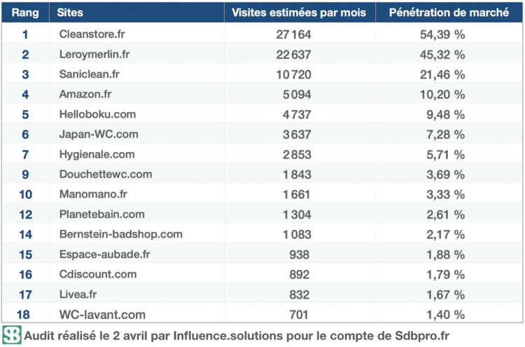 Les sites sont classés en fonction de la position moyenne qu’ils occupent réellement sur la page du moteur de recherche : Cleanstore.fr est bien le premier à apparaître sur la majorité des mots-clés, Leroymerlin.fr le deuxième… Hygienale.com le septième et Douchettewc.fr le neuvième. Entre ces deux-là apparaît un site qui n’appartient pas à l’univers de la salle de bains (Wikipedia.org, par exemple). Ce qui explique que les rangs ne se suivent pas toujours dans le tableau.