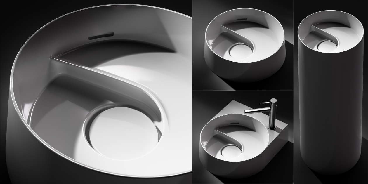 Pour contrôler l’écoulement de l’eau, le designer la fait cheminer le long d’un plan incliné qui, incurvé, s’enroule dans l’espace circulaire de la cuve. Au-delà du rendu esthétique, en l’absence de fond plat, la saleté ne s’accumule pas, comme aspirée vers la large bonde plate, qui est associée à un siphon gain de place (dont le fabricant estime qu’il libère 50 % d’espace de rangement). L’idée de la chasse d’eau à effet vortex n’est pas loin !